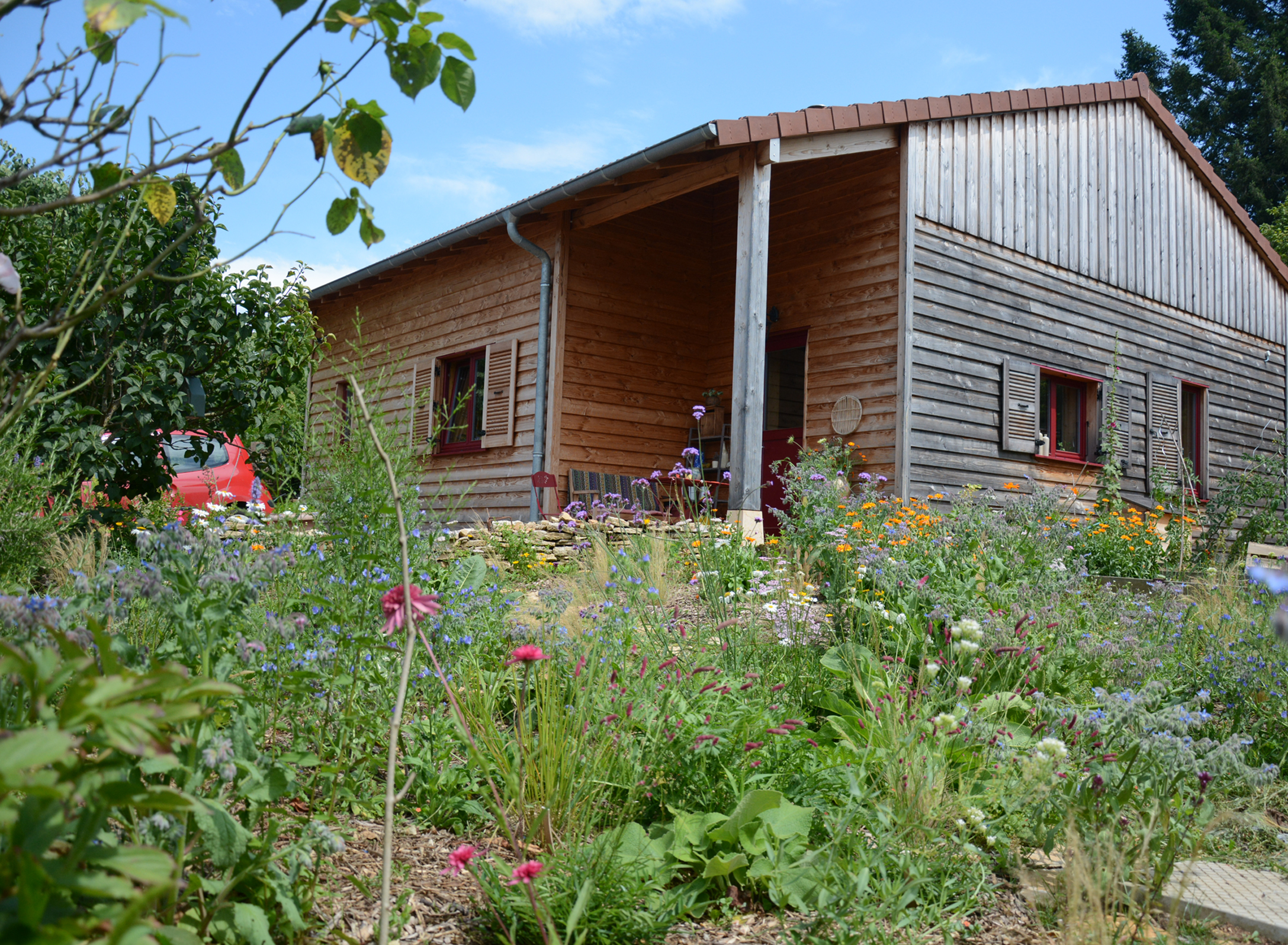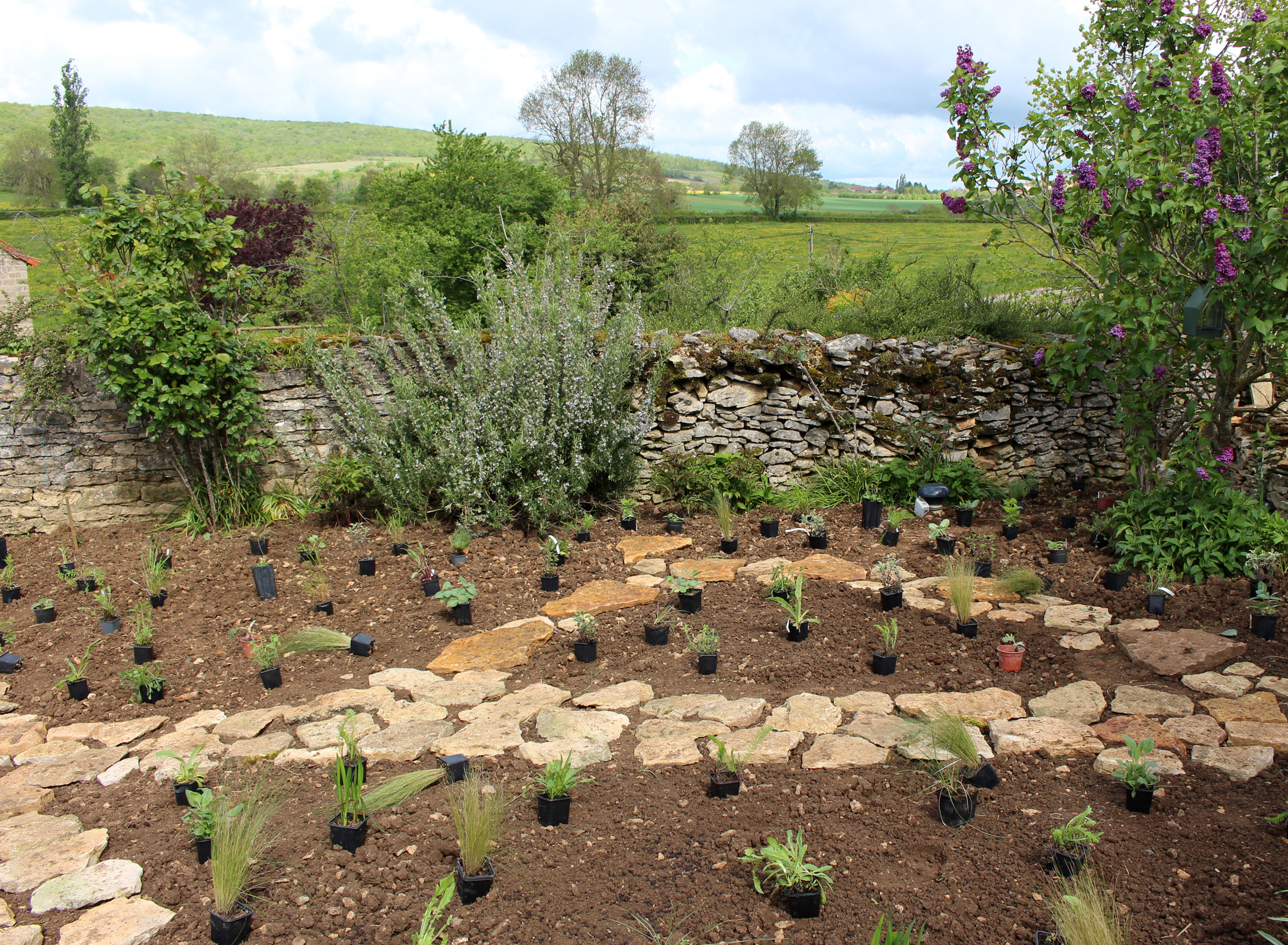 Flagy est un joli petit village du Clunisois marqué par un sol calcaire. Les propriétaires ont acquis une parcelle en centre-village pour y construire une maison en paille, bardée de bois. Leur parcelle est longiforme, bordée de murs en pierres sèches. Des arbres et arbustes sont déjà présents sur le terrain. Néanmoins ils souhaitaient un parvis fleuri en entrée de leur habitation.